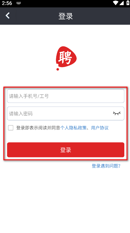 3.输入手机号或工号与密码,勾选登录即表示阅读并同意个人隐私政策及用户协议,再点击登录。