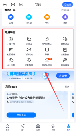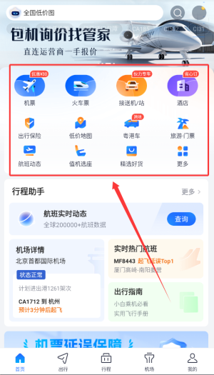 3、首页汇集机票预订、列车购票、接送机服务以及航班状态查询等出行功能。