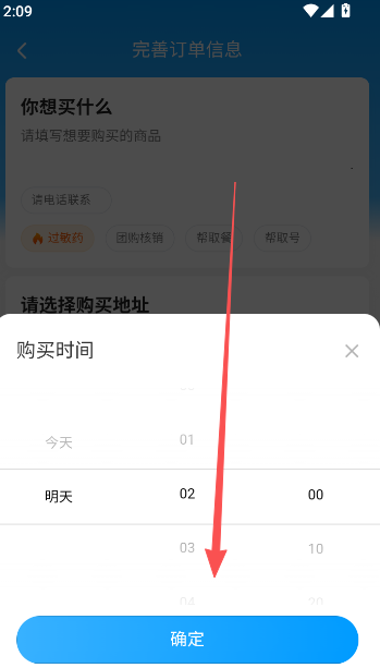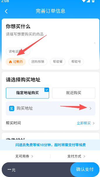 2、填写订单详细信息:包括商品名称类别、购买地址以及期望的帮买时间,即预约配送时间。