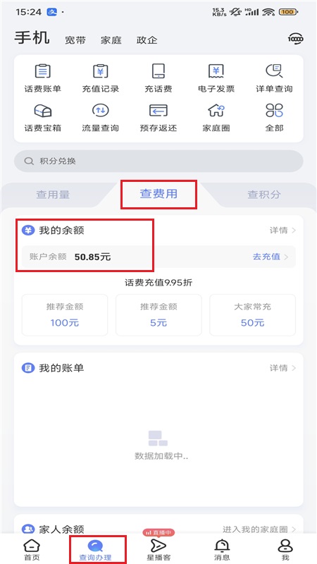 3、之后找到“查询办理”板块,点击查费用选项,页面下方就会显示账户当前的余额情况;
