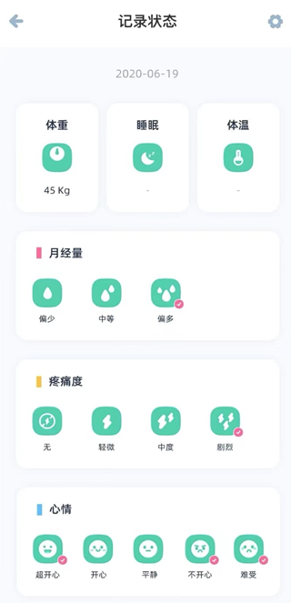 3、详尽的状态记录,支持多维度信息录入。除了月经周期,还可以记录体重变化、睡眠状况、心情起伏等,关注身体的每一个细微变化,全面呵护身心健康。