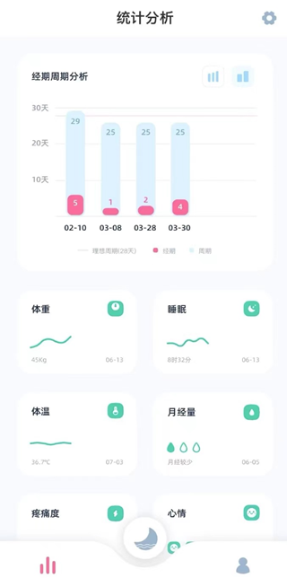 2、健康数据的统计与分析,并以多视图形式进行展示和趋势解读;用户也可选择按周期查看,方便观察单周期内各项数值的具体情况,从而更深入地了解自己的经期规律。