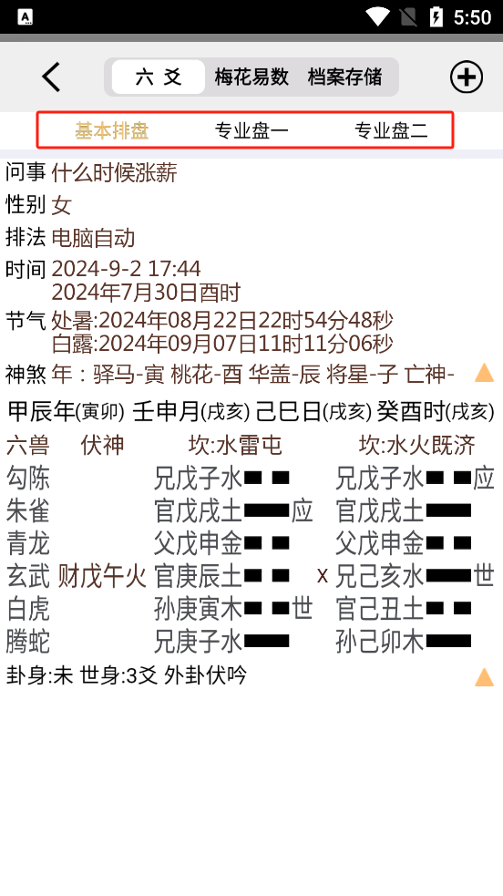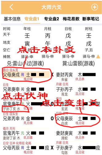 (2)选择专业盘2的用户,点击本卦爻、伏神、变卦即可查看对应的释义提示;