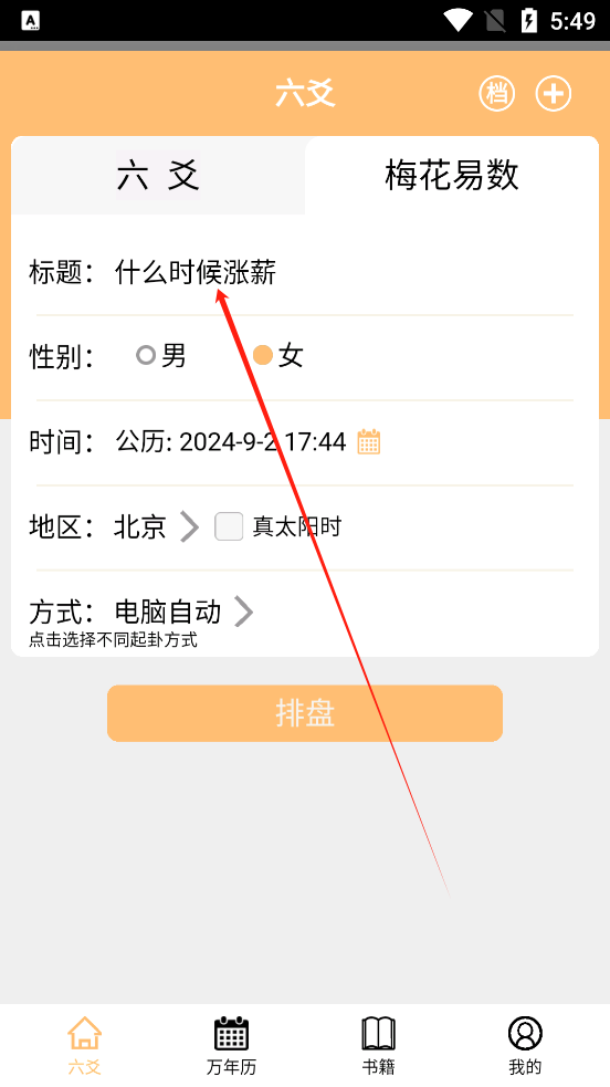 1、登录进入app首页后,在输入框填写自己想要咨询的问题,点击排盘按钮即可生成对应排盘;