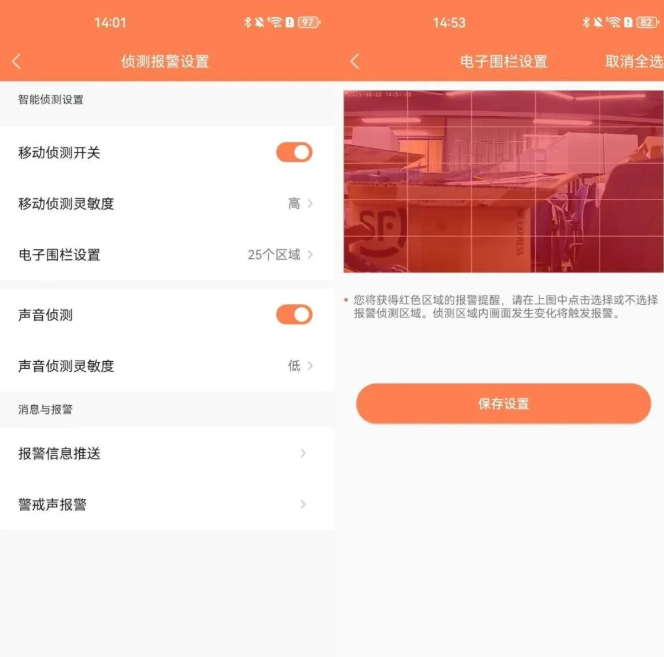 开启侦测报警后,需在消息推送设置中打开通知,即可接收报警消息;【警戒声报警】功能可在人形靠近时发出警示音,请根据实际需要谨慎启用;电子围栏设置将画面划分为25个区域,可自定义选择侦测范围,选中区域内的画面变化将触发报警。