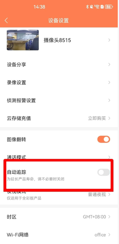 点击监控画面右上角图标,即可进入设备设置页面,可进行以下配置:设备分享、录像设置、侦测报警、云存储充值、图像翻转、通话模式、自动追踪、夜视模式、时区调整、WiFi网络、设备参数与固件版本查看。