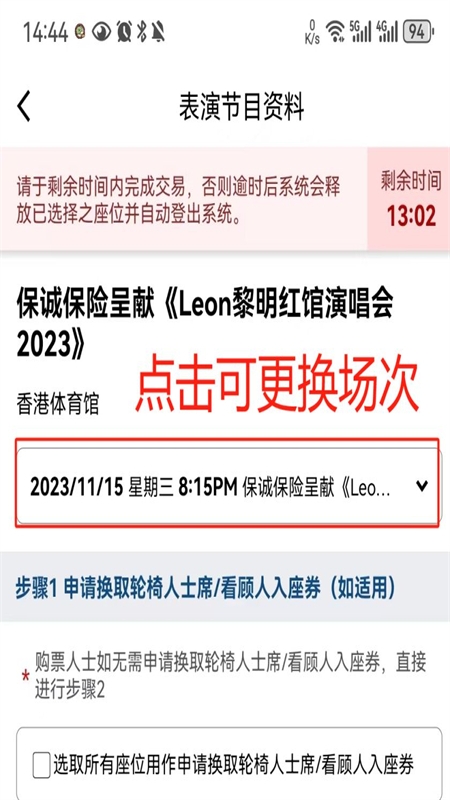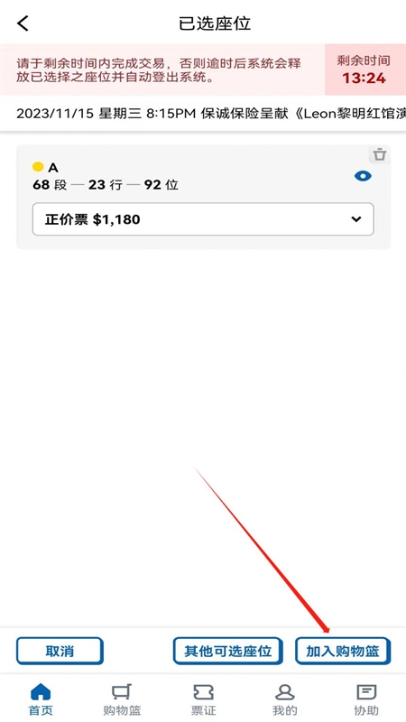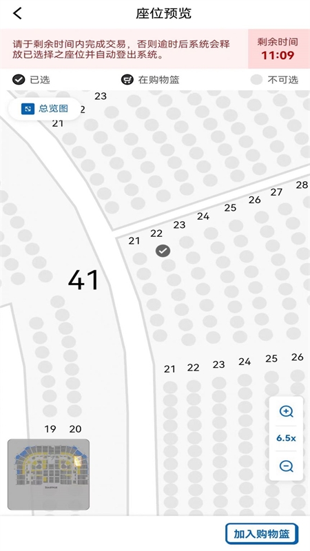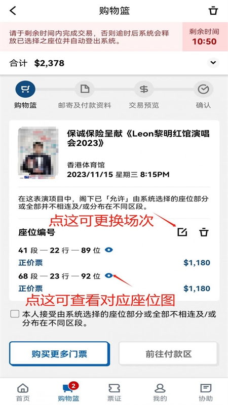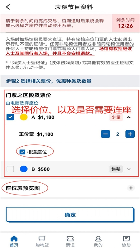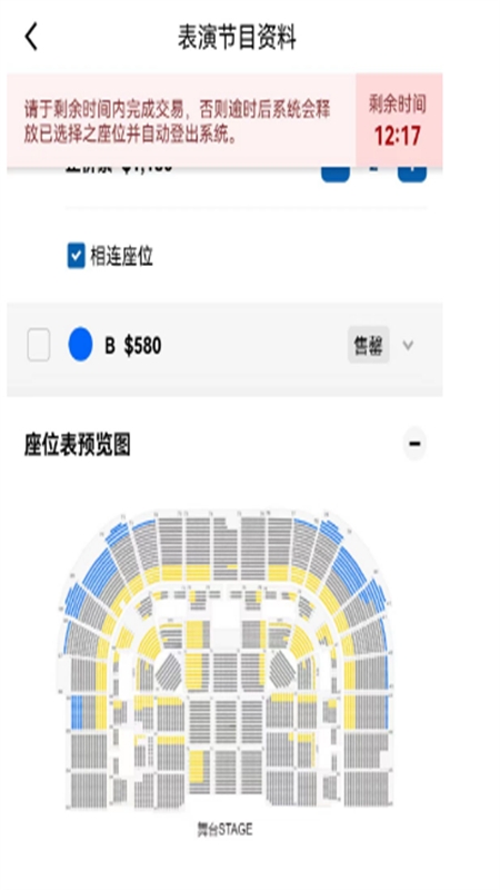 3、选取票价区域,如需连座购票,系统会在无法连座时给予提示;