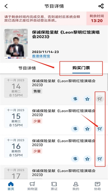 2、进入详情页点击购买门票,选择所需场次,点击购物车图标确认场次信息;