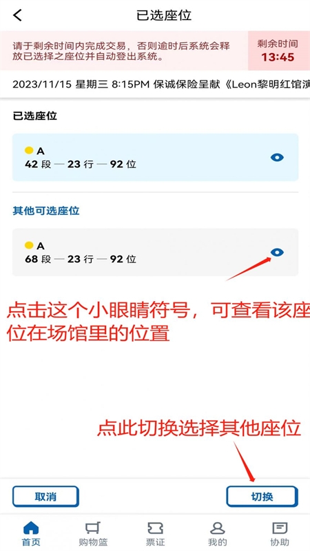 4、查看已选座位,也可点击查看其他可选座位进行调整;