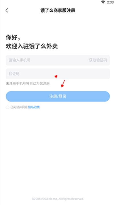 2、接着输入您的手机号码及收到的验证码,点击注册或登录按钮完成账户验证。