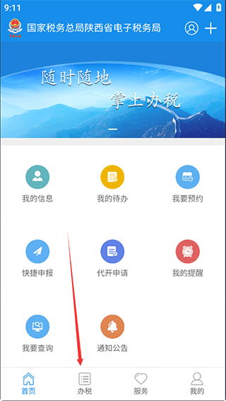 1、在本站下载并登录陕西电子税务局应用,点击底部【办税】功能入口;