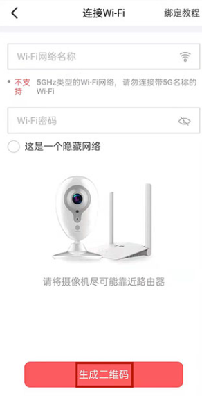 输入当前WiFi名称与密码,点击生成二维码,让摄像头扫描该二维码即可完成绑定。