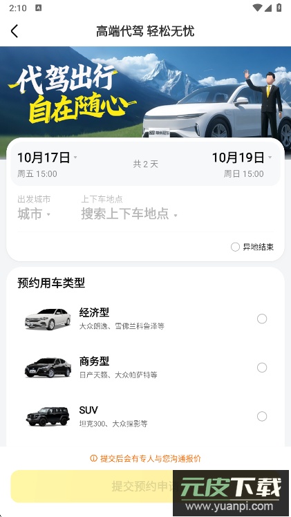 2、进入后选择出发城市、上下车地点以及预约用车类型,点击提交预约申请即可。