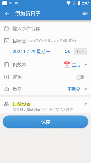 所有信息填写完毕后,点击页面顶部的保存按钮,该倒数日便成功设置完成。