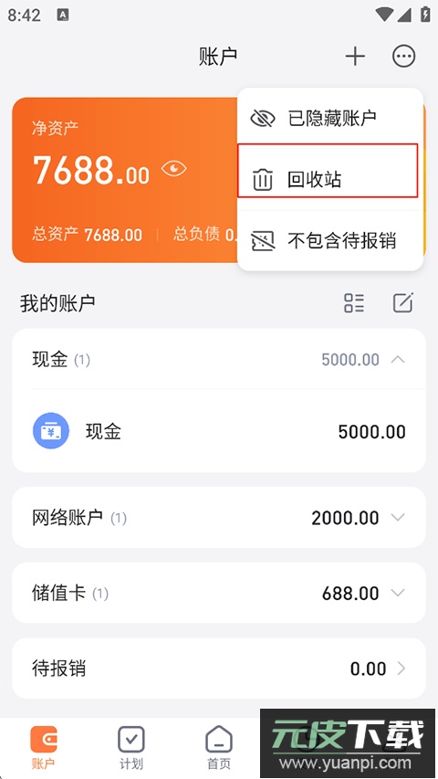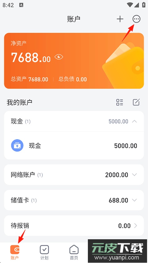 1、打开挖财记账APP,进入账户页并点击右上角扩展按钮;
