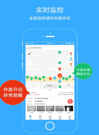 【跟踪定位】在地图上实时显示所有井盖位置与状态,井盖丢失后可持续追踪定位;