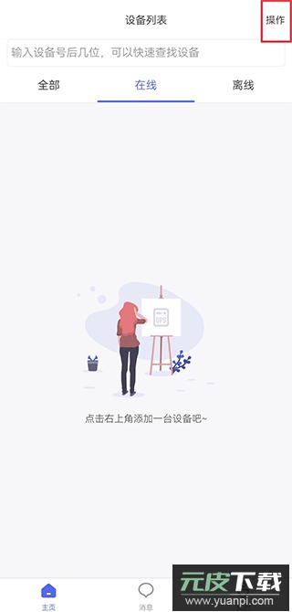 1、启动智安星应用,在主页点击右上角操作按钮,选择添加设备;