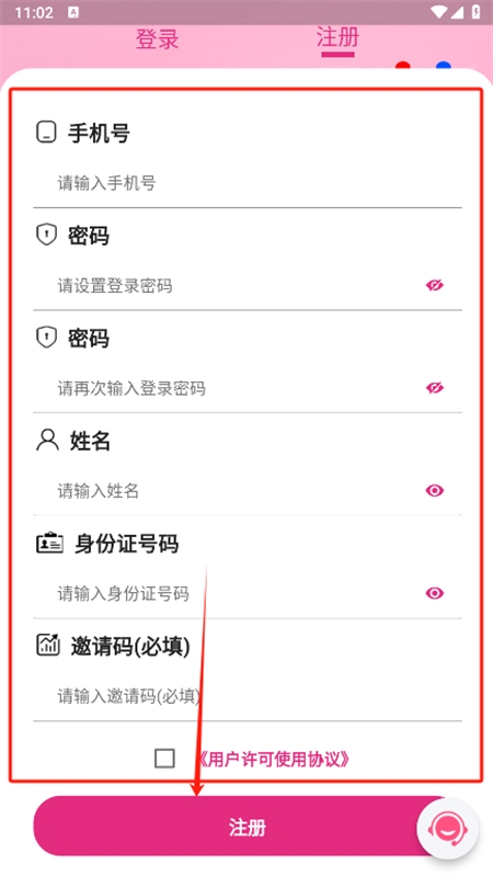 3、填写手机号码、设置密码并输入姓名等基本信息,阅读并同意用户协议后,点击提交即可完成注册。