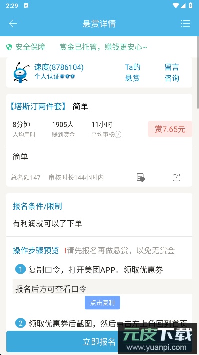 这是一个悬赏互助与兼职赚钱的平台,核心模式是帮助他人完成任务并获取赏金。每日有大量悬赏任务可供选择,且每笔赏金均由平台托管。任务完成后,赏金会立即发放至账户,有效避免了拖欠或欺诈风险。