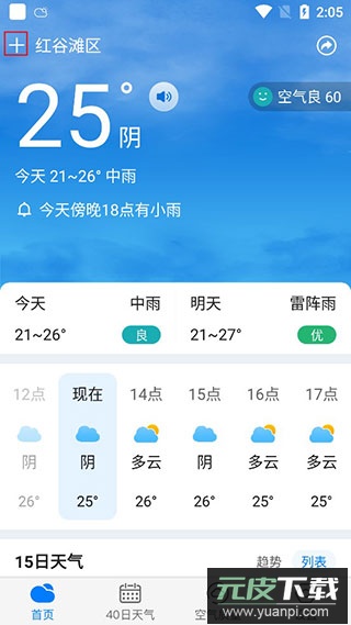应用主页面直接呈现未来五天的天气概况,聚焦关键气象信息,查看快速又直观。
