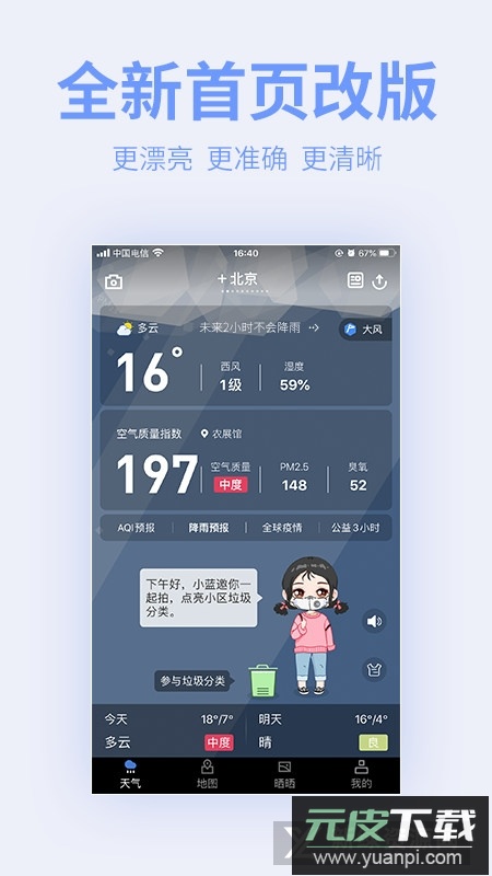 1、可视化动态的全球天气及空气信息图:数据来源权威,天气及空气质量动态预报精确到区县,让用户清楚掌握蓝天、雾霾的变化趋势,还提供气象灾害和雾霾监测预警,台风动向也能随时查看,遇到各类天气都能提前做好准备;