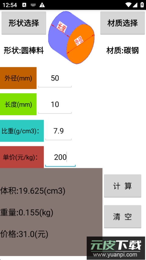 2、选择材料的形状与具体材质,输入材料的相关尺寸参数。