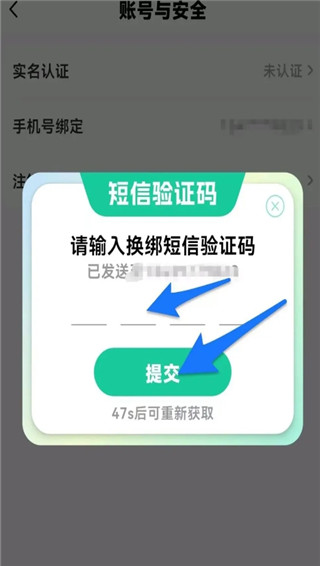最后,在弹出页面中输入新手机号与验证码,点击【提交】即可完成更换。