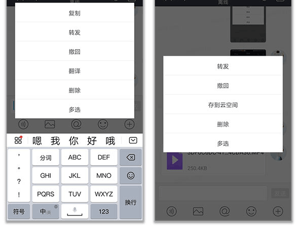支持收发即时消息、文件、音视频等富媒体内容;音视频文件可在线播放;消息可进行复制、转发、撤回、删除或翻译;文件与音视频消息能直接保存至云空间。