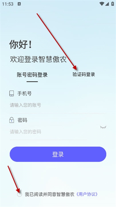 2、打开应用程序后,输入手机号和密码完成登录;若尚未注册,可选择验证码登录方式。