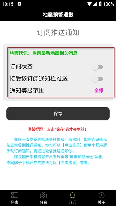 3、随后切换到【订阅】页面,开启该页面的通知开关,即可第一时间接收地震最新消息;