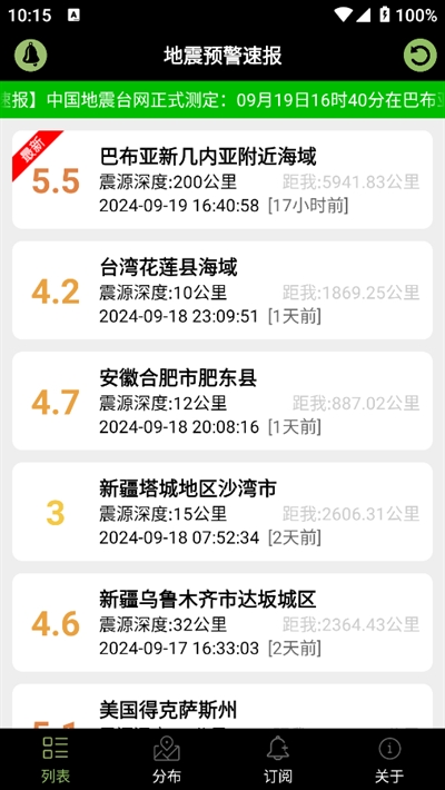 4、最后返回首页的【列表】板块,这里汇总展示了各地地震情况,您可以点击任一项目进行详细查看。