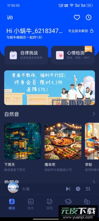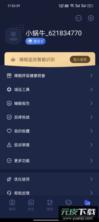 4、睡眠界面提供自然音效辅助入眠,系统将自动记录夜间梦话、鼾声等音频信息。