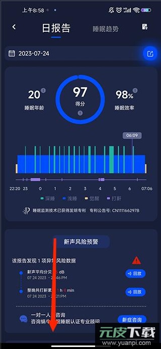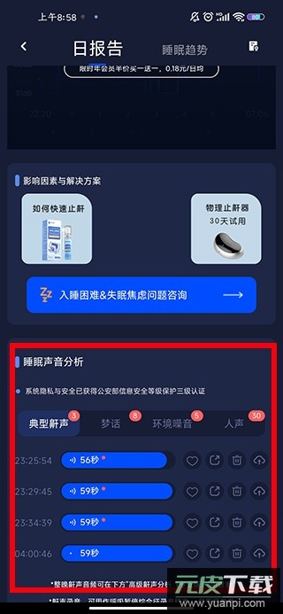 5、找到“睡眠声音分析”板块,即可收听睡眠中录制的声音片段。