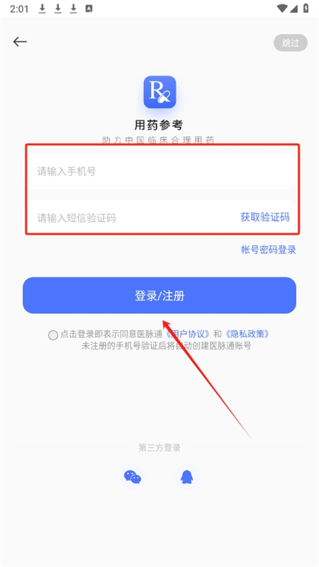 3、在注册页面输入手机号码及获取的验证码,阅读并同意用户协议后,点击登录或注册按钮完成流程。