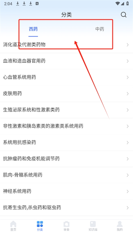 3、点击分类栏目,可按照西药或中药的详细分类检索相关药物信息;