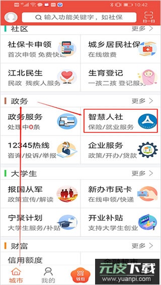 1、首先打开应用,在底部菜单栏选择“城市”板块,进入“政务”栏目后点击“智慧人社”服务;