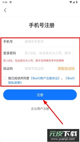 4、在注册页面填写手机号码、设置登录密码,获取并输入短信验证码,勾选同意相关协议后点击注册按钮,即可完成账户创建。
