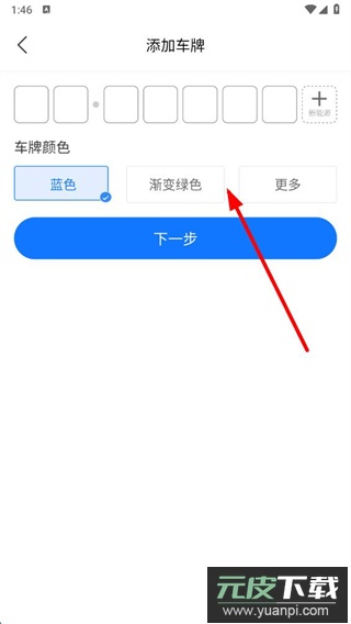 4、在添加车牌页面输入车牌信息并选择车牌颜色,点击下一步,按照后续提示完成车辆添加。