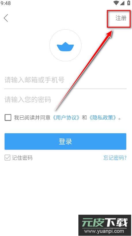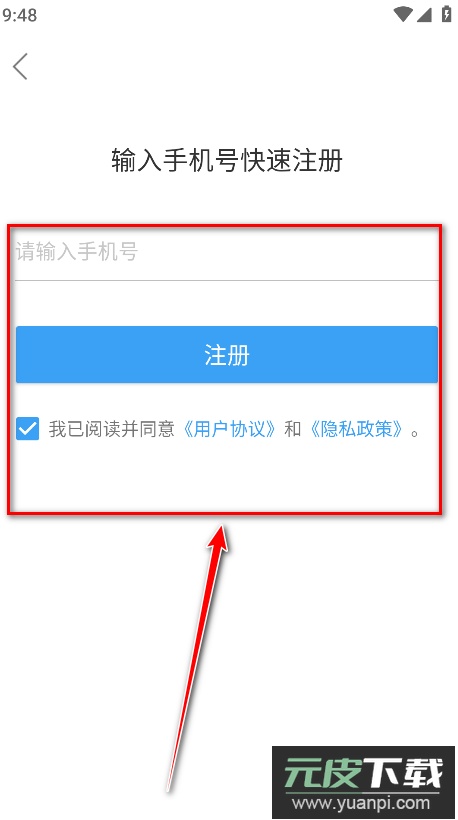 4.填写您的手机号码,勾选同意《用户协议》与《隐私政策》,点击注册按钮继续。