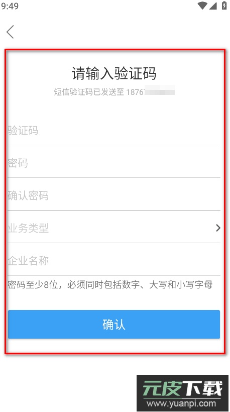 5.输入收到的短信验证码,设置登录密码并确认,选择业务类型与企业名称,最后点击确认完成注册。