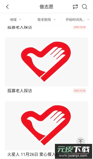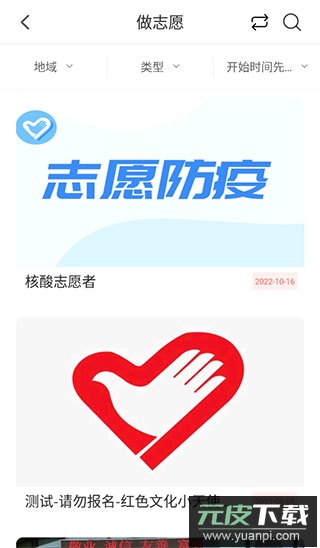 4、以“做志愿”为例,可以根据所在地域、活动类型和开始时间筛选查看各类志愿活动。
