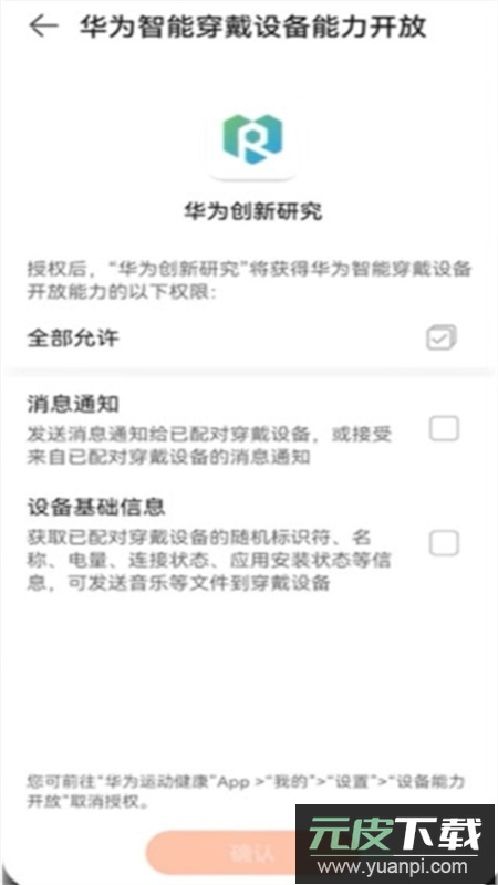 4、根据授权提示,跳转至“华为智能穿戴设备能力开放”界面,按需勾选选项,点击确定。