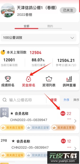 2、能够查询相关比赛,涵盖正式赛与训放赛;可按地区选择,搜索公棚、比赛或足环编号,并查询奖金信息。