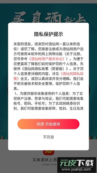 1、下载安装本站提供的酒仙网app,启动后会显示隐私保护提示,点击同意即可进入;