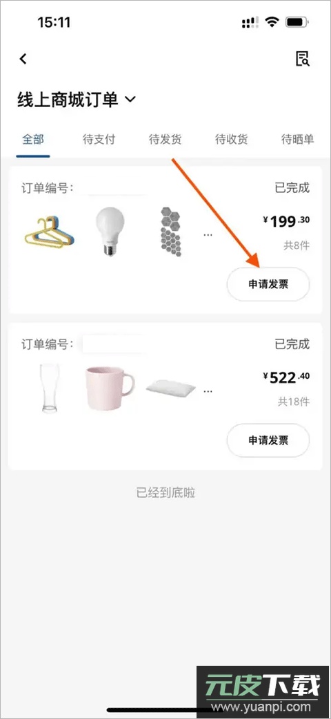 1、启动宜家家居网上商城官方应用,进入“我的订单”页面查看订单列表。