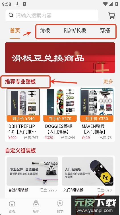 滑板商城:提供一站式购物服务,商品包括滑板板面、支架、轮子、轴承、砂纸、桥钉等各类配件,以及相关的鞋服配饰;商城供应入门与高端组装板,并设有自选组装和配件补给包选项,以满足不同用户的个性化需求。