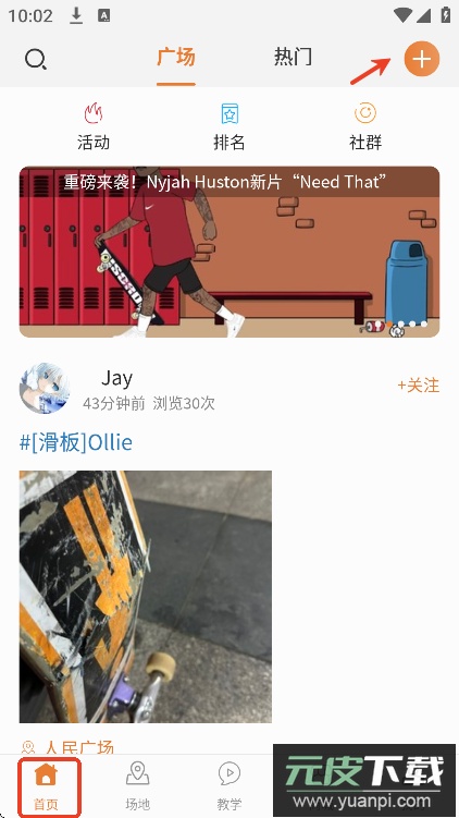 4. 用户还可以在首页的滑板社区发表自己的学习体会,与其他用户交流经验;点击右上角加号按钮即可发布帖子。