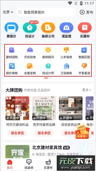 1、打开齐家装修app,可见首页、找装修、买建材、装新家及我的等板块,首页提供多种装修方案供选择;
