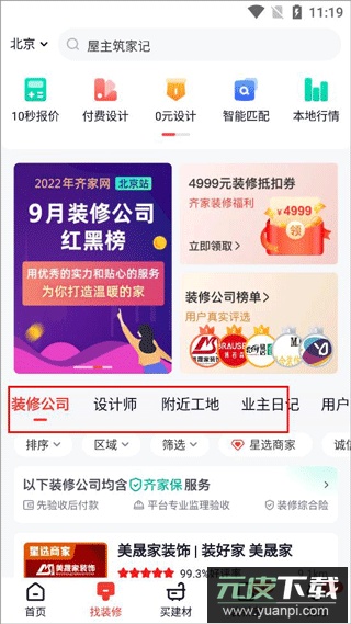 2、进入找装修板块,用户可查找装修公司与家装设计师;