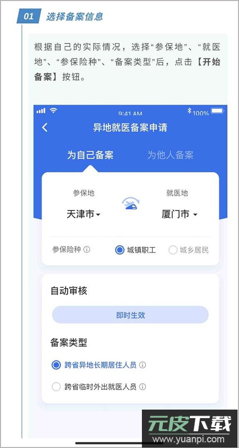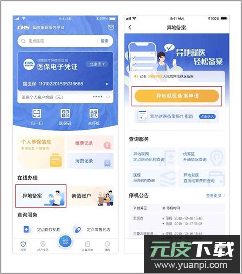 1. 打开app首页,点击“异地备案”进入相关页面,选择“异地就医备案申请”功能;